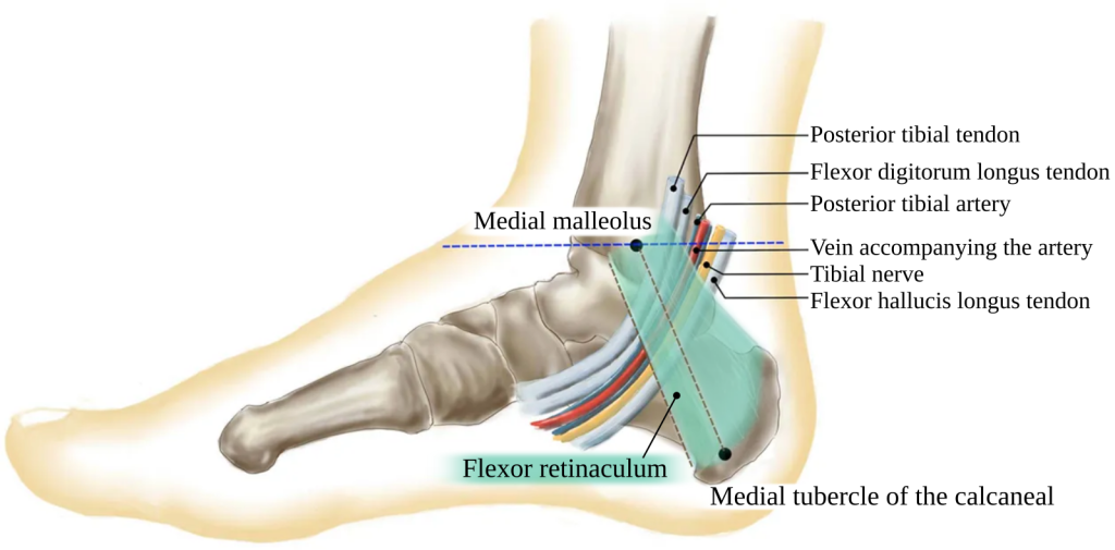 Pour comprendre le syndrome du tunnel tarsien, il est essentiel de se familiariser avec l’anatomie du pied. Imaginons le pied comme une boîte contenant des câbles (les nerfs) et des tuyaux (les tendons). Le tunnel tarsien est un passage étroit dans cette boîte, où l’un des principaux câbles électriques, le nerf tibial, traverse le pied. Si ce passage devient trop étroit, le nerf tibial est comprimé, comme un câble coincé dans une gaine trop serrée.