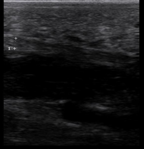 Une échographie est réalisée chez cette patiente montrant : une fasciopathie plantaire ce qui correspond à une lésion du fascia plantaire induisant un épaississement dégénératif de celui-ci :