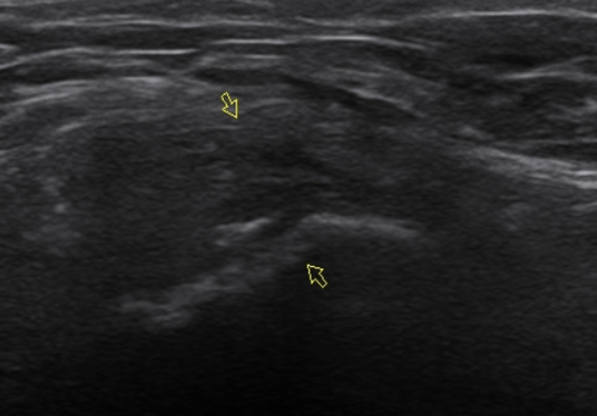 On retrouve à l’examen clinique une souffrance isolée des muscles adducteurs, le reste de l’examen est normal. Une échographie est réalisée chez ce patient montrant : une déchirure partielle du tendon du muscle long adducteur.