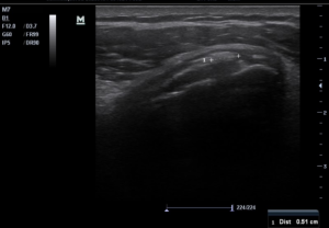 Ultrasound examination (Figures 1 and 2) conducted on the left shoulder showed 1) subscapularis calcific tendinopathy type 1 (4x5mm) and 2) infraspinatus calcific tendinopathy type 2 (14.4×15.6mm).