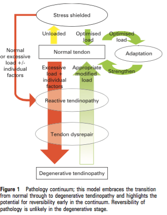 Depuis une dizaine d’années la notion de « tendinite » (ite = inflammation) a laissé la place à la notion de « tendinopathie », depuis qu’il a été démontré, à de multiples reprises, qu’il n’existait pas de mécanisme inflammatoire présent dans ces tendons malades. Malheureusement la croyance en l’existence de la tendinite dans le milieu médical, a la dent dure, et la prescription ou l’auto-prescription d’anti-inflammatoires continue. Le Dr Cook (entre autres) a passé en revue l’ensemble des dernières données de la recherche, et est arrivé à la conclusion qu’on ne pouvait pas d’avantage parler de « tendinopathie », comme d’une seule et unique lésion , mais qu’il existait un réel continuum tendinopathique avec 3 phases distinctes. La reconnaissance de ces 3 phases, semble jouer un rôle majeur dans la compréhension de la souffrance du patient, mais aussi dans le choix du traitement le plus adapté. La pathologie tendineuse se développe du fait d’une surcharge tendineuse, par compression ou par tension. Cette surcharge est elle quantifiable ? Cela va dépendre de l’age, du sexe, de la masse graisseuse, des antécédents sportifs au cours de la croissance, des médicaments utilisés, de l’historique médical, etc … et est donc spécifique à chaque individu.