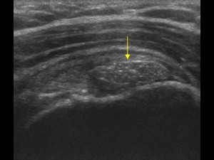 - La phase pré-calcique, totalement asymptomatique. La calcification est découverte de manière fortuite à l’echographique, sous la forme d’un léger dépot linéaire.