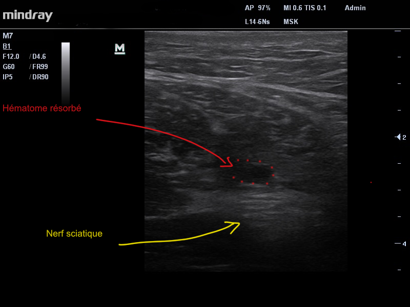 La douleur entraine une boiterie, et rend très difficile la position assise. A l’interrogatoire on retrouve une douleur intermittente dans le mollet du même côté. Le patient ne se plaint pas de douleur de dos. A l’examen il présente un hématome important à la racine de la cuisse, nous décidons de réaliser une échographie qui est l’examen le plus utile et le moins cher , et permet une étude des fibres musculaires, des tendons et des aponévroses (enveloppes des muscles).