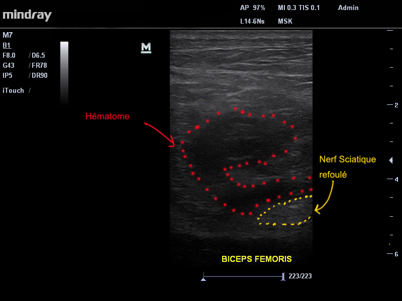 Notre examen retrouve la présence d’une déchirure musculaire de grade 3 ( sur une échelle de 0 à 4 ) au niveau de la portion la plus haute du biceps femoris (fait partie des muscles ischio-jambiers) à sa jonction avec le tendon conjoint. Fait important dans ce cas, l’hématome « refoule » latéralement le nerf sciatique réalisant à minima une irritation voire une compression de ce dernier. C’est la proximité de l’hématome avec ce nerf qui permet d’expliquer la douleur ressentie dans le mollet de notre patient. (Image 1).